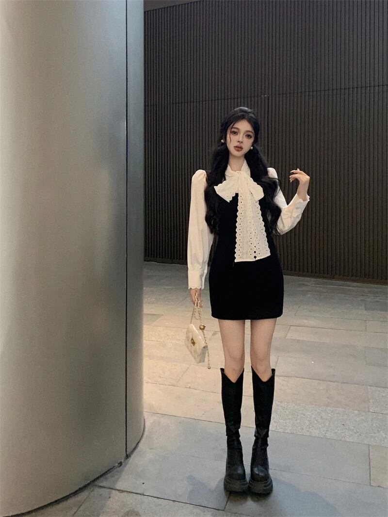 フレンチレースリボン長袖シャツトップ気質白ブラウスY2k黒ストラップドレスショートベストスカートセット2024 ロング ホワイト ブラック