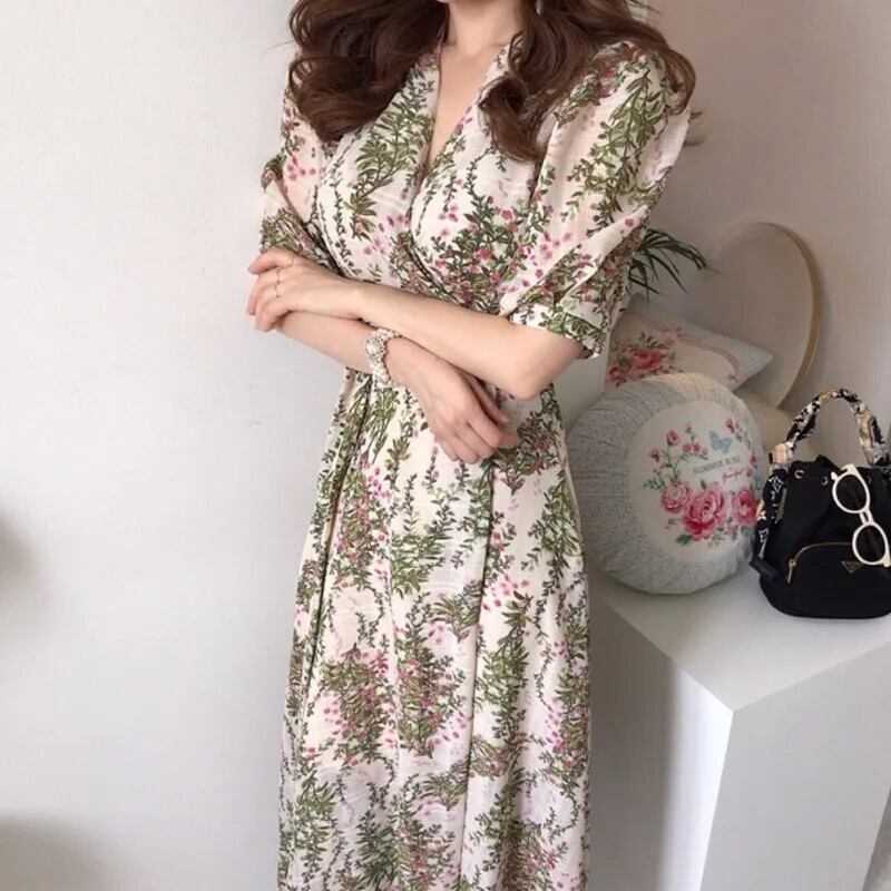 ワンピース包帯ウエストドレスボヘミアンマキシ夏 V ネックネクタイ長袖半袖シフォンプリントドレス 2024 ショート ロング ハーフスリーブ サマー 夏物 Vネック