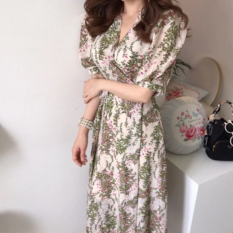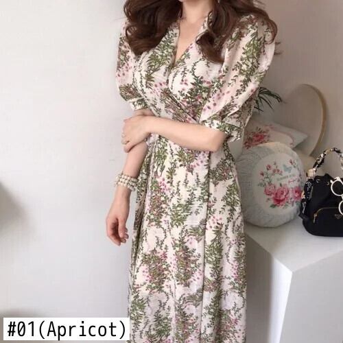 ワンピース包帯ウエストドレスボヘミアンマキシ夏 V ネックネクタイ長袖半袖シフォンプリントドレス 2024 ショート ロング ハーフスリーブ サマー 夏物 Vネック