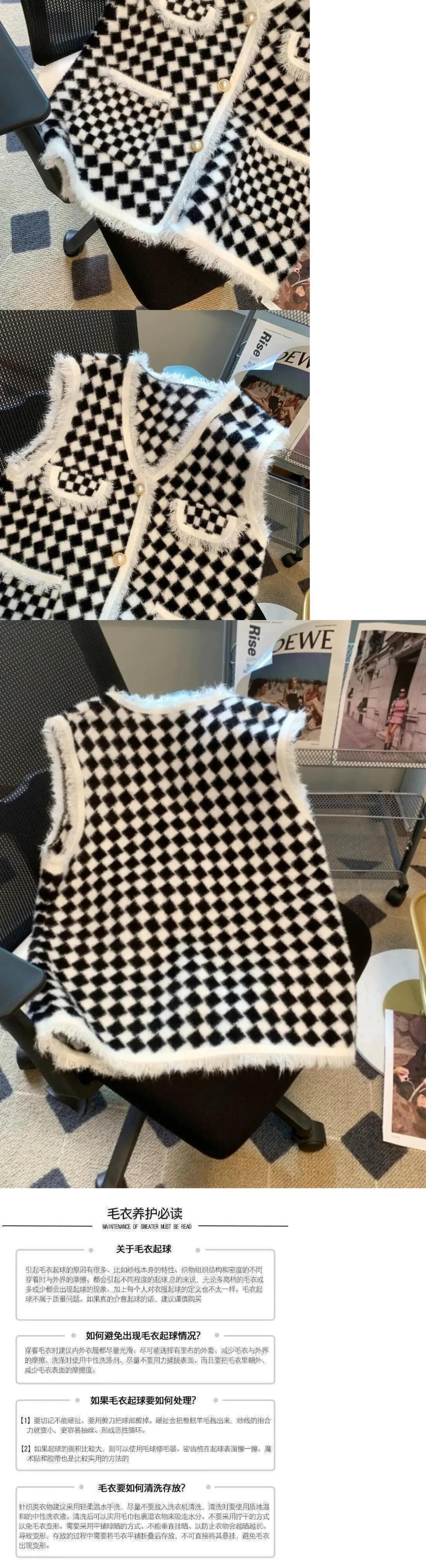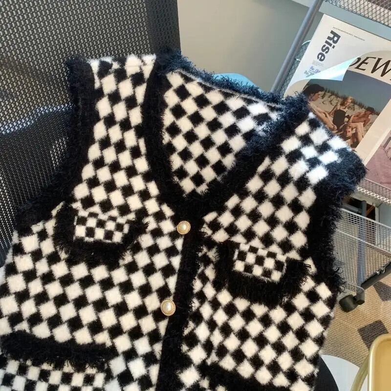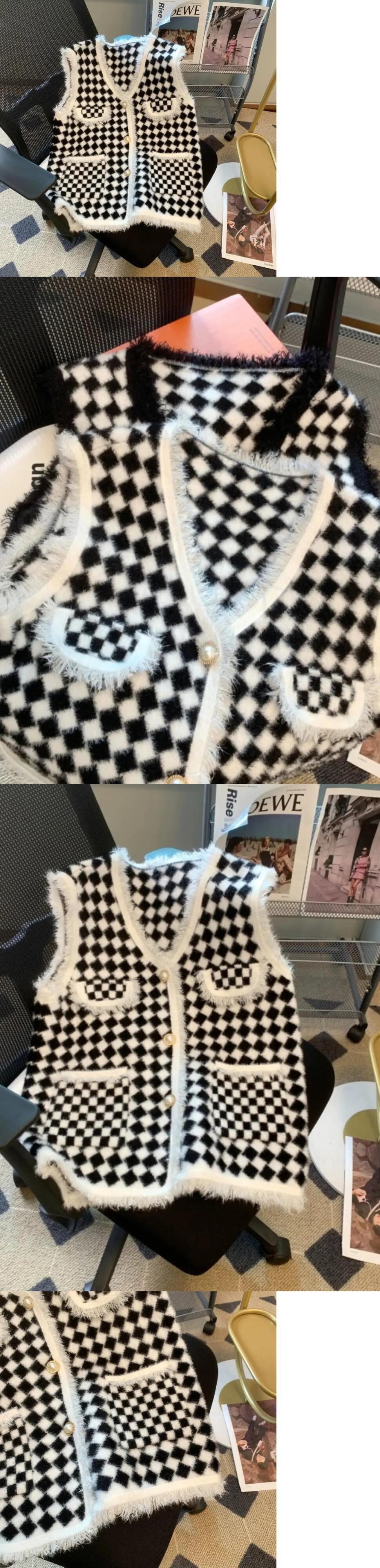 ミンクカシミヤベルベットサウザンドバードチェック柄ニットベストチャレコY2kブラックストリートクロップドジャケット厚いチョッキ