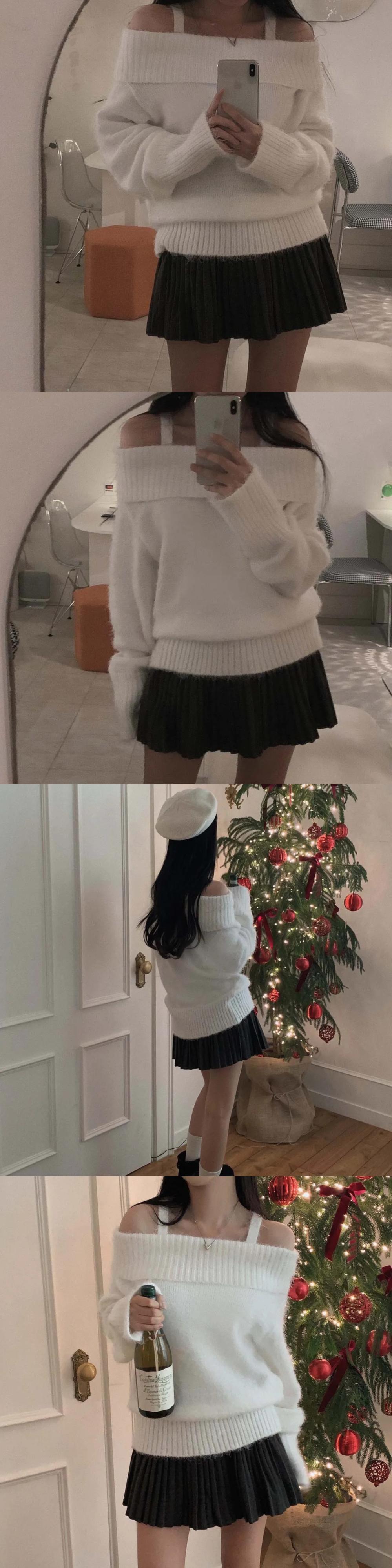 気質ワンネックオフショルダー特大セーター長袖白ニットモヘアトップス 2024 シック ロング ホワイト