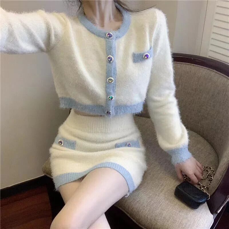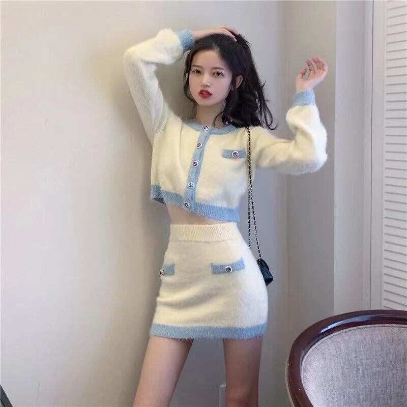 セーターコントラストカラー 2 点セットレディース衣装クロップドカーディガンコートニットトップスリム A ラインスカート Y2k スタイル Aライン