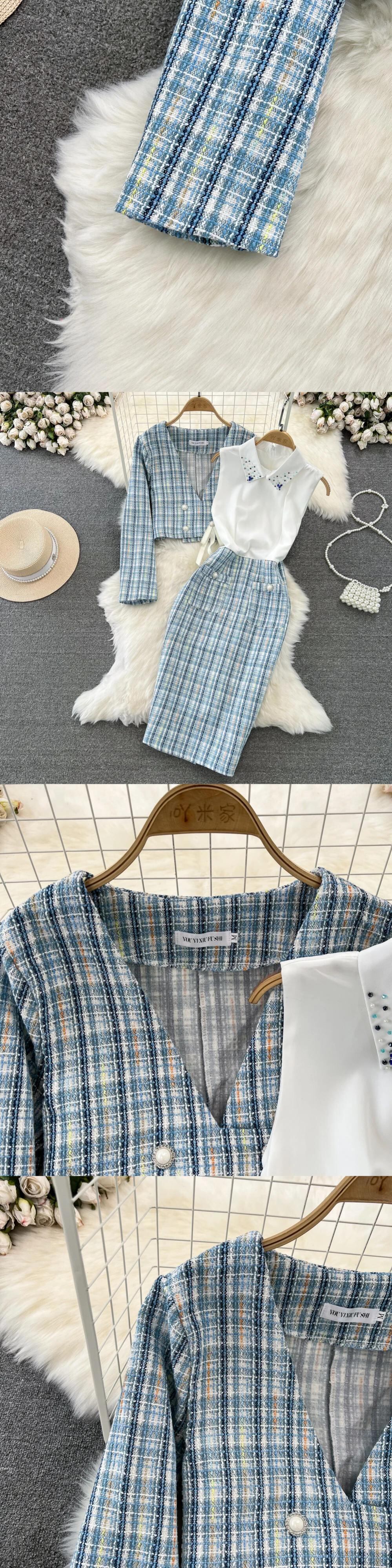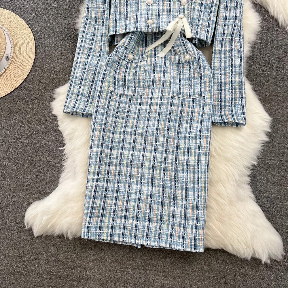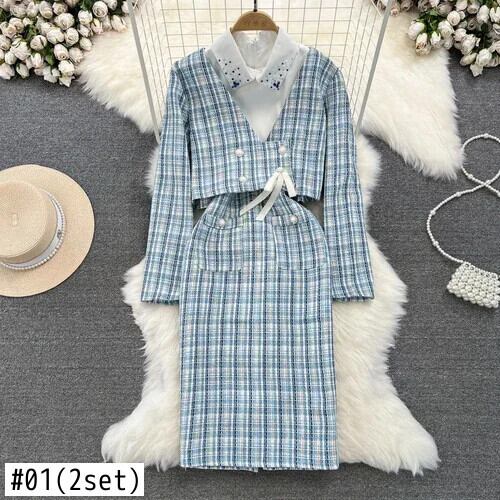 秋冬ノッチ襟ボタン膝丈ドレスオフィスレディエンパイアスリムAラインチェック柄Vネックツイードコート オータム 秋物 ウィンター 冬物 会社 学校 通勤や通学にも