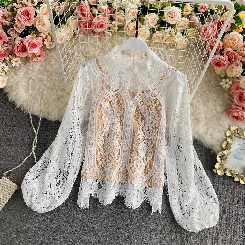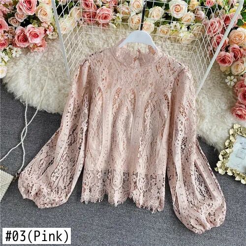 セクシーレースアウトショートブラウスランタン長袖スタンドカラーシャツピンクホワイトルーズトップス2024 ロング