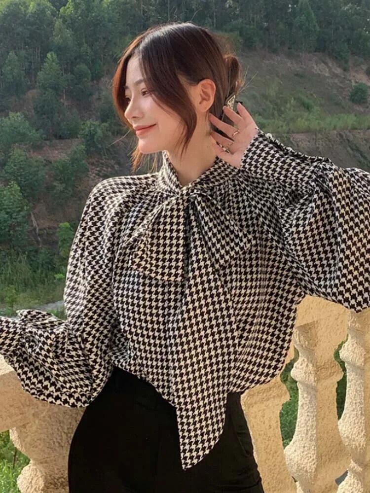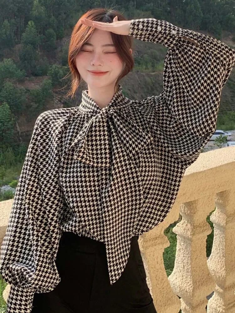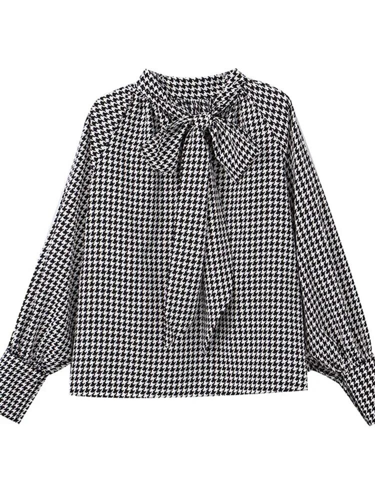 ボウネックシフォンレディース春ルーズランタンスリーブトップスストライプブラウス千鳥格子リボンシャツ スプリング 春物