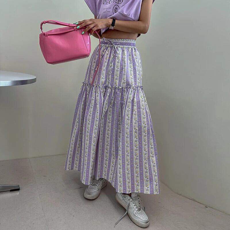 甘いウエストスリムレースアップ木製耳エッジパッチワーク大き裾花柄スカートマキシビーチロングスカート 大人ガーリー スウィート キュート カジュアル