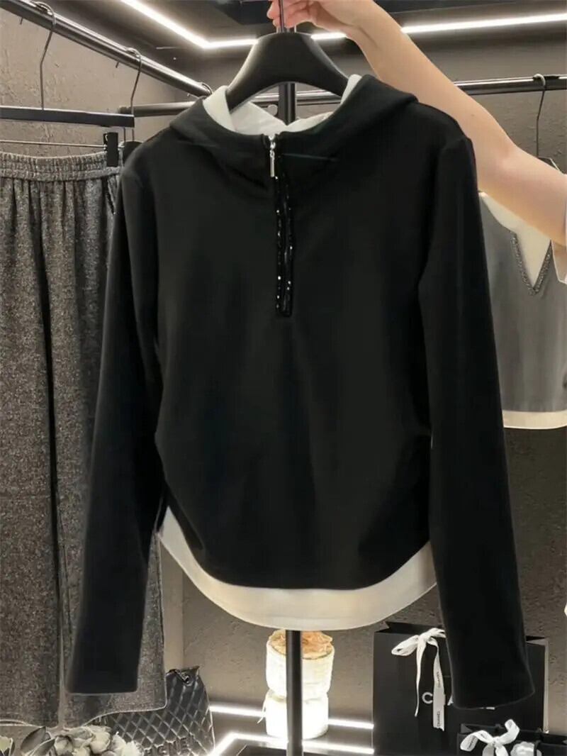 スリムプリーツトップコントラストカラーフェイクツーピースフード付き長袖ドイツベルベットスウェットシャツグランジパーカーコットンTシャツ ロング