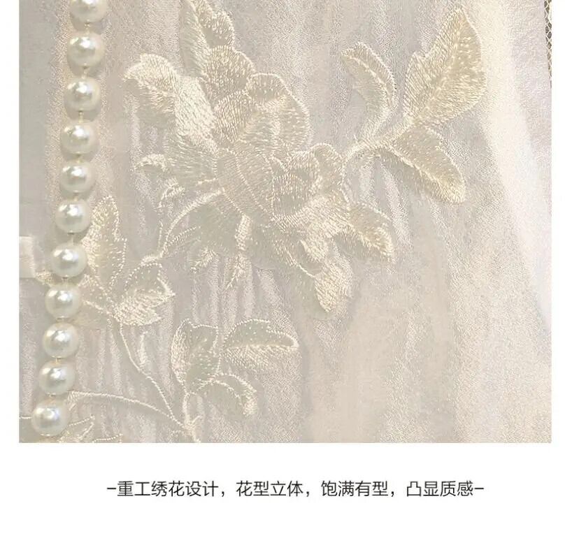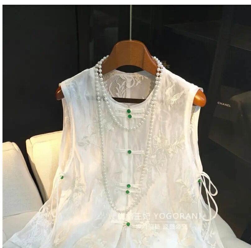 中国風トップ唐刺繍白いレース花袍マンダリンカラーベスト着用 ホワイト フラワーデザイン