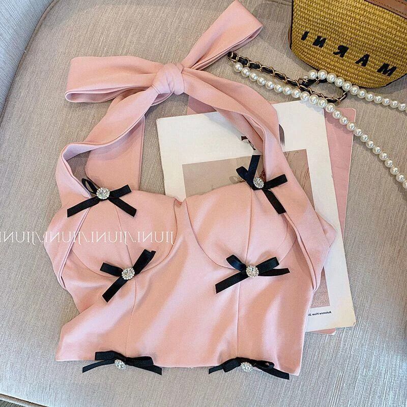 セクシー弓ピンクホルタータンクトップスかぎ針編み作物 Ropa デ夏チュニックキャミソールシフォンシャツ 2024 リボン サマー 夏物