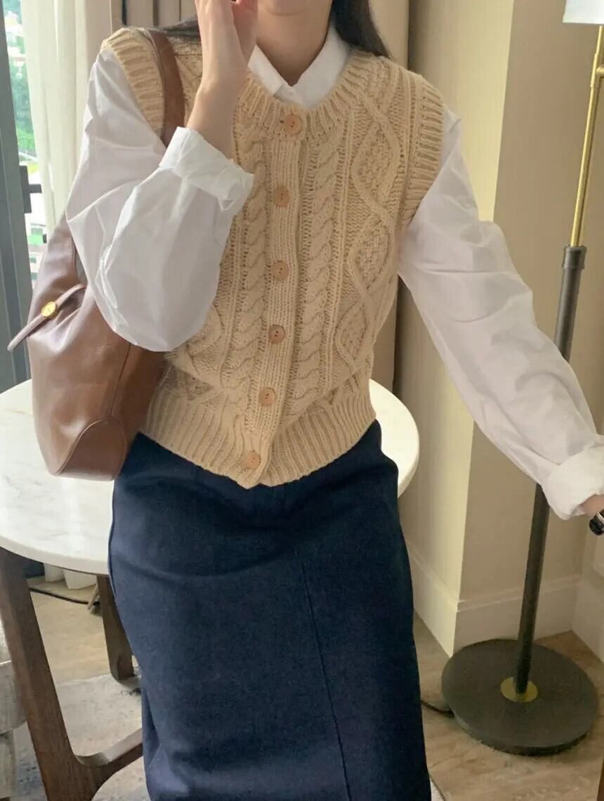 ラペルバブルスリーブストライプシャツ 2024 春グレーツイストニットベスト Chalecos パラルーズ気質セータートップスコート スプリング 春物