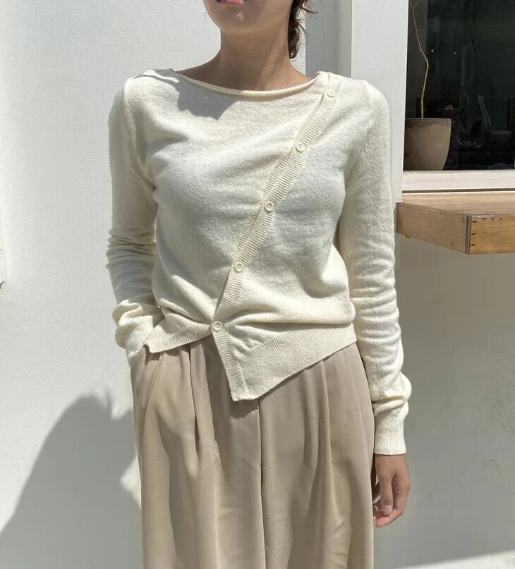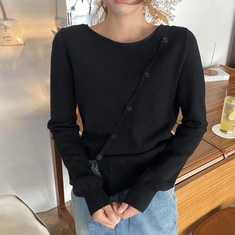 シックシンプルネック斜めボタン長袖ニットプルオーバーセーターセーターブラックトップセーター ロング