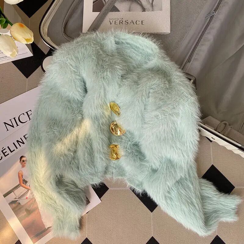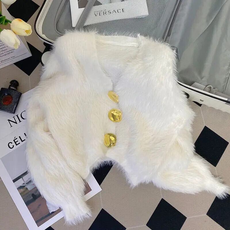 秋冬 V ネックニットミンクフリースコートトップ多用途ゴールドボタンルーズカーディガンセーター オータム 秋物 ウィンター 冬物 Vネック