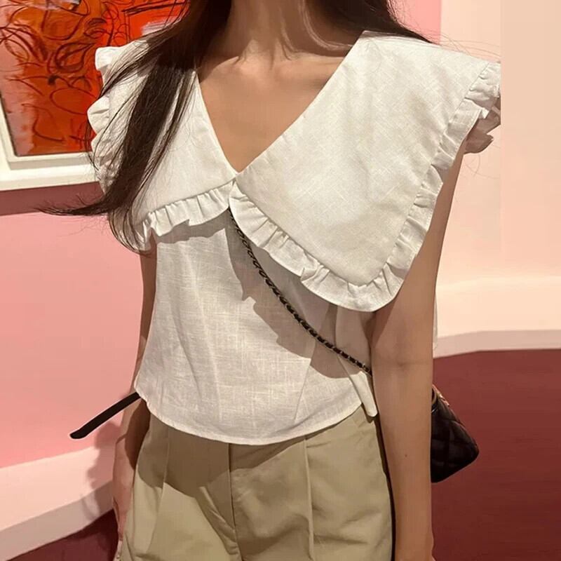 タンク & キャミソール ブラウス 2024 夏ドールネックシャツノースリーブショートトップルーズシャツ サマー 夏物