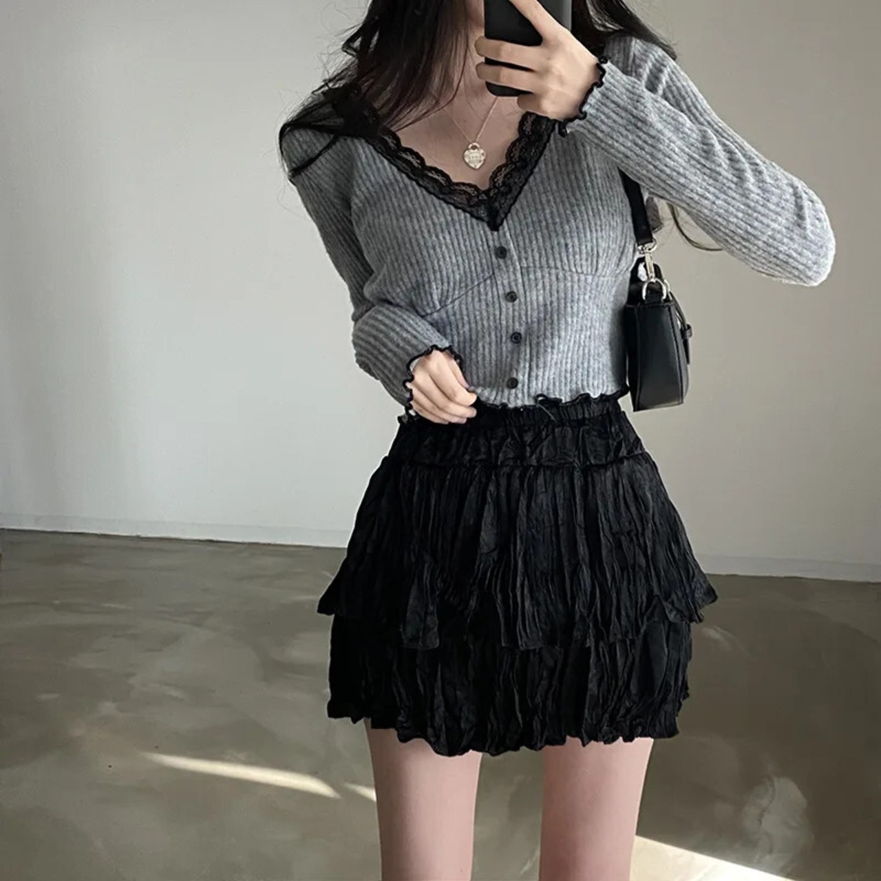 ジャージセータートップスプルオーバー V ネックレースエッジウエストニット Y2k グレー 2024 シャツグランジ甘い作物セーター 大人ガーリー スウィート キュート カジュアル Vネック