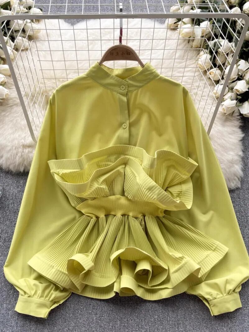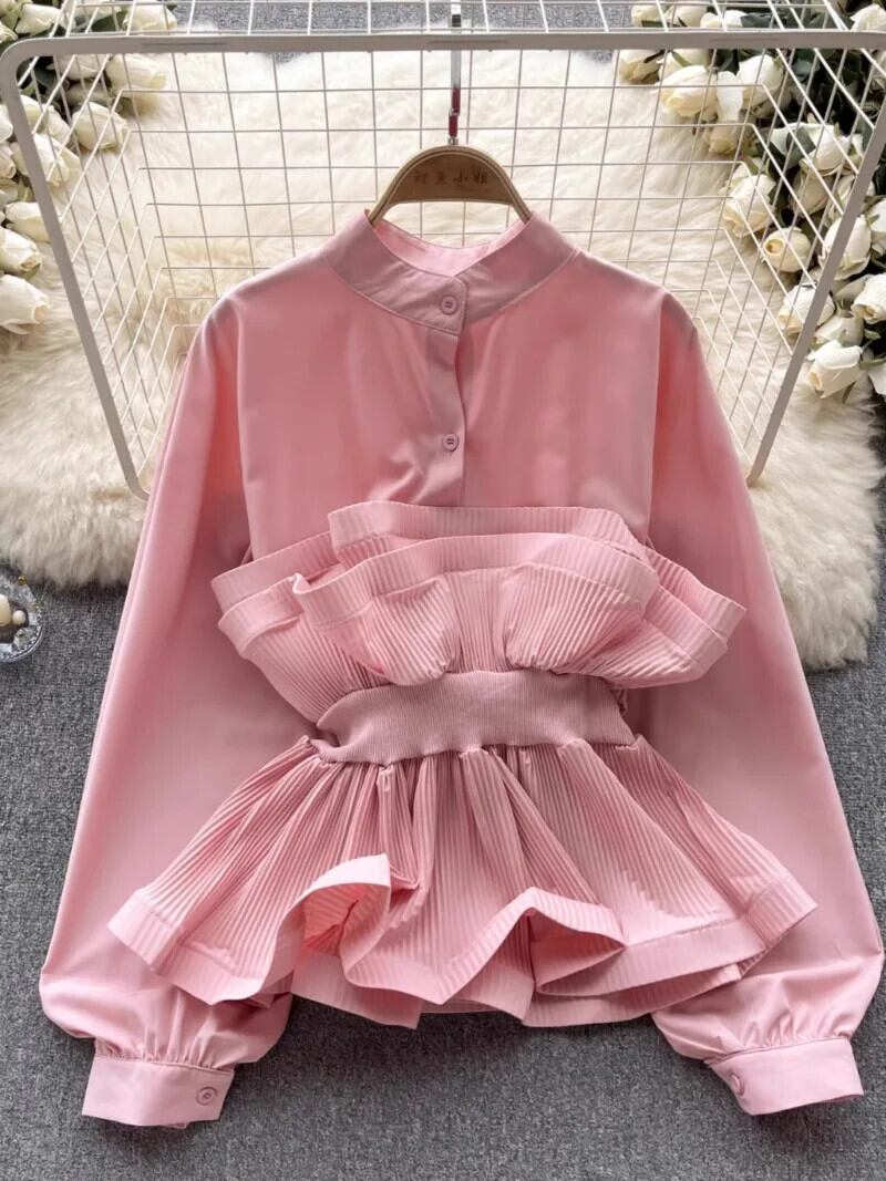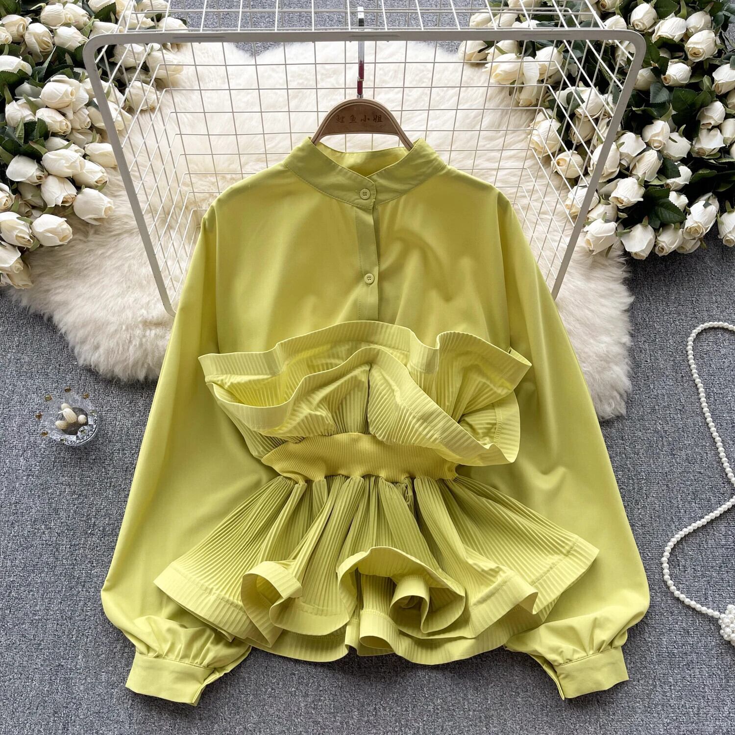 パフ長袖シャツプリーツフリルブラウスパッチワーク気質Y2kトップスリムウエスト甘い夏2024 ロング 大人ガーリー スウィート キュート カジュアル サマー 夏物
