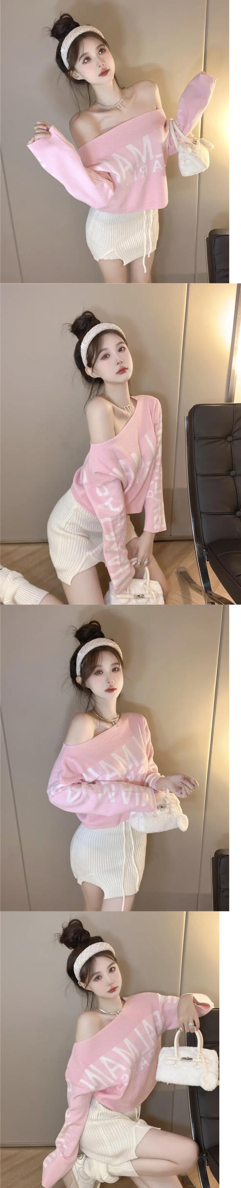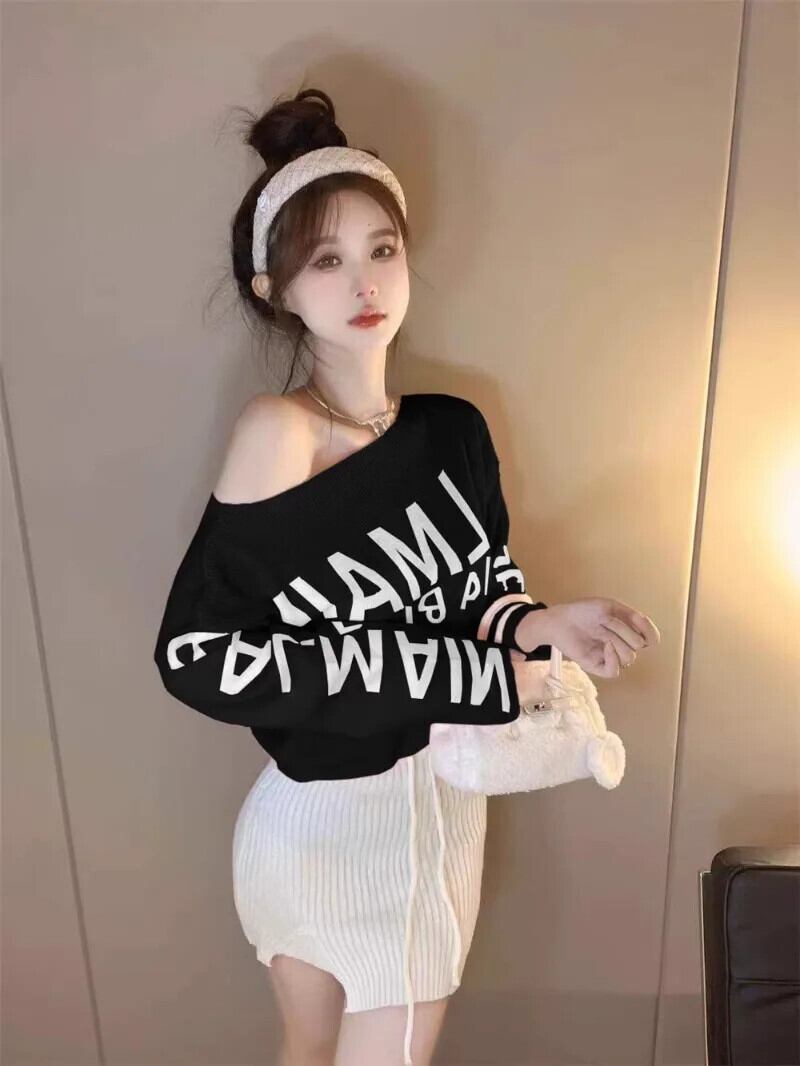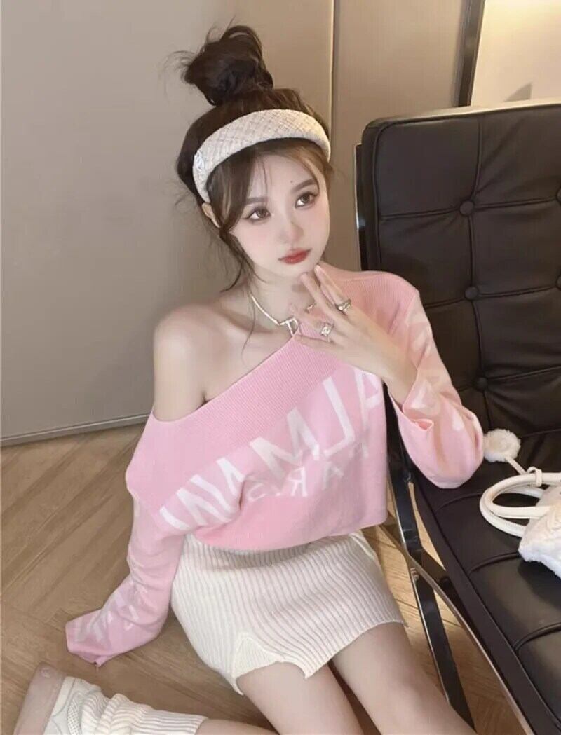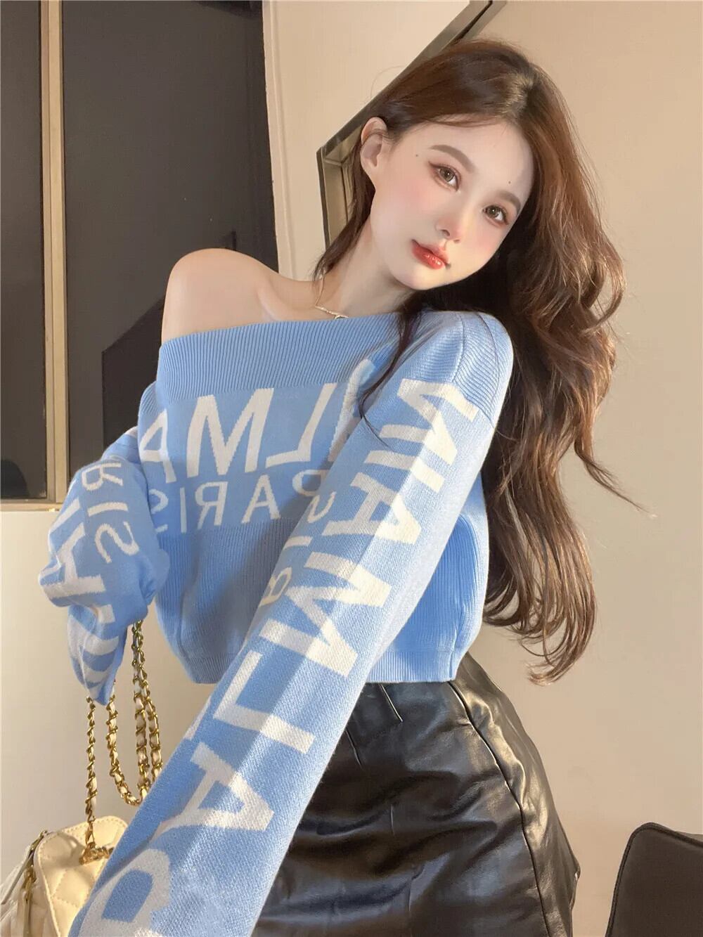 セーター デ ニッチ ワンオフショルダー ショート セーター ルーズ ニット 長袖 トップ ブルー レター セーター グランジ ロング