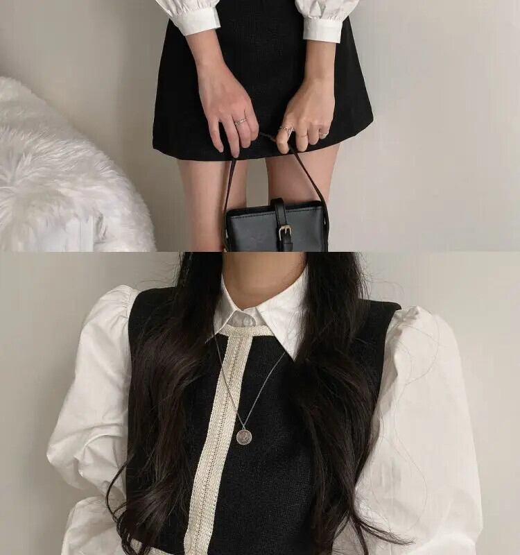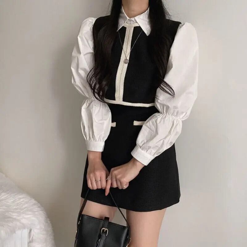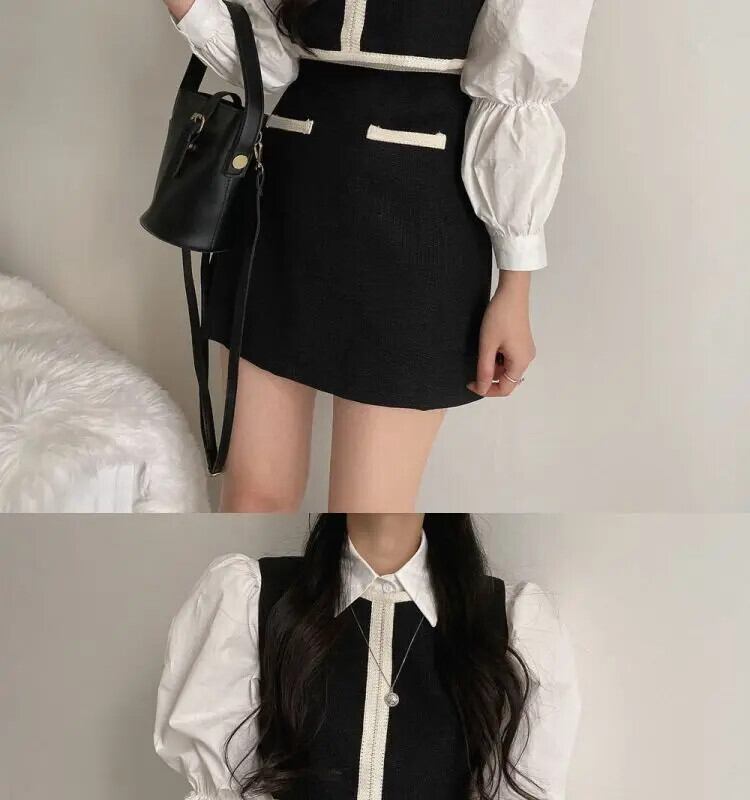 気質ラペルシャツ対照的黒ベストウエストスカートレディース 3 ピースセット Y2k ブラウスクロップドトップスクラブ ブラック