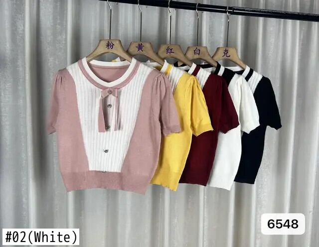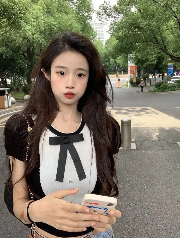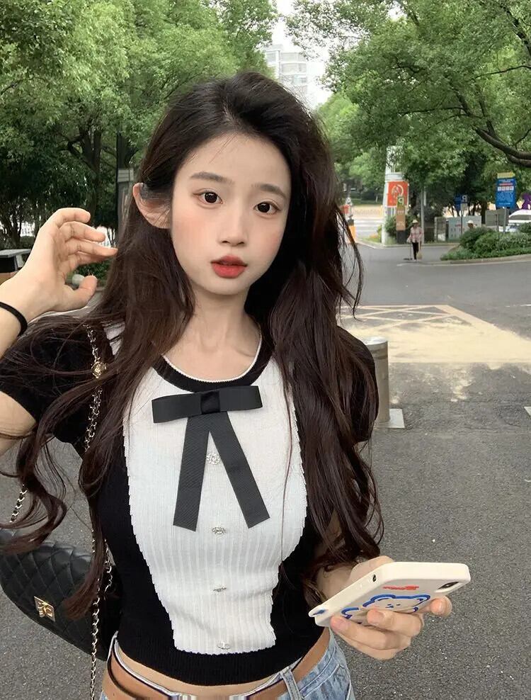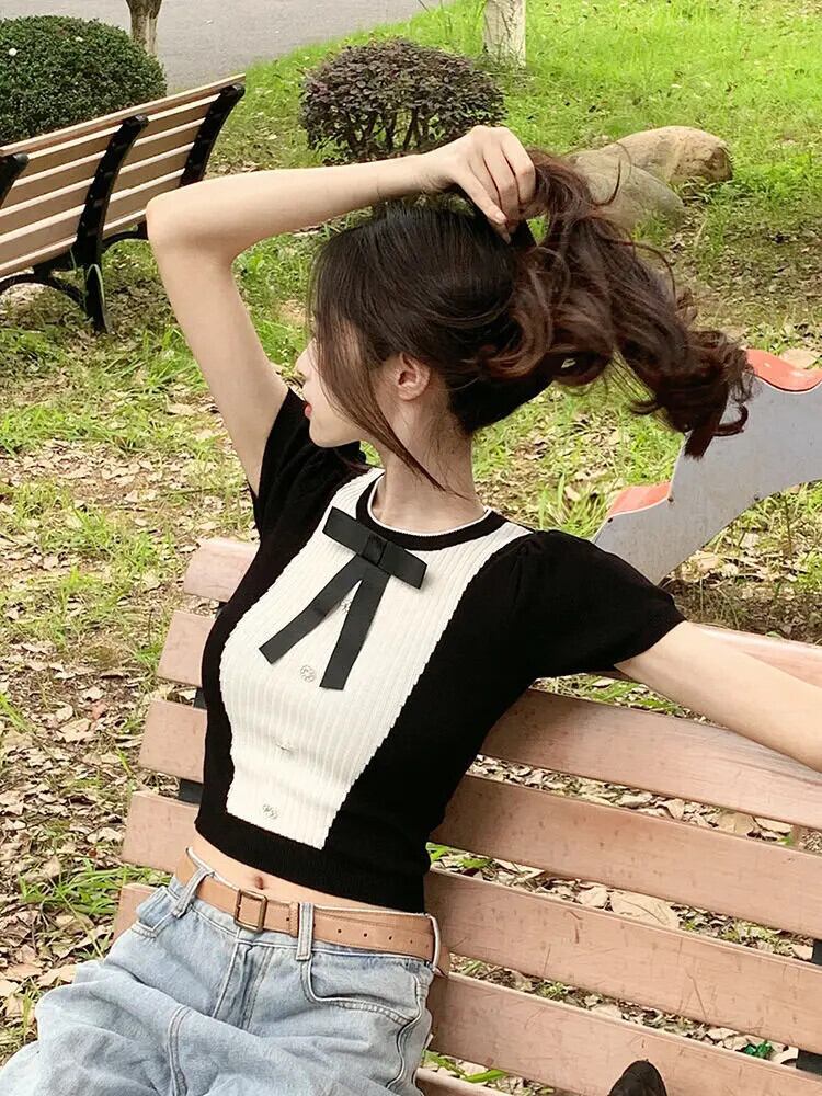 フレンチ甘いコントラストカラー弓ニット 2024 ニッチスリムフィットプルオーバー O ネック黒セーターグラフィック T シャツ ブラック リボン 大人ガーリー スウィート キュート カジュアル Oネック Tシャツ