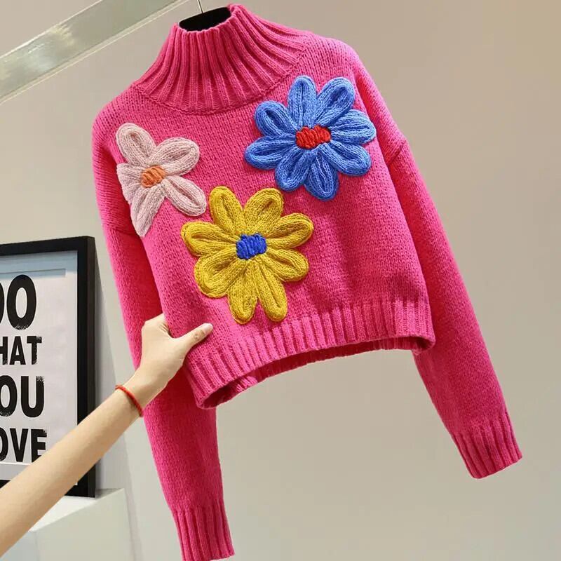 花刺繍セータールーズ長袖 O ネックニットプルオーバー 2024 秋厚いストリート ロング オータム 秋物 Oネック フラワーデザイン