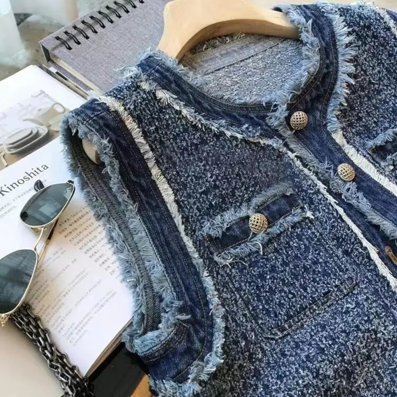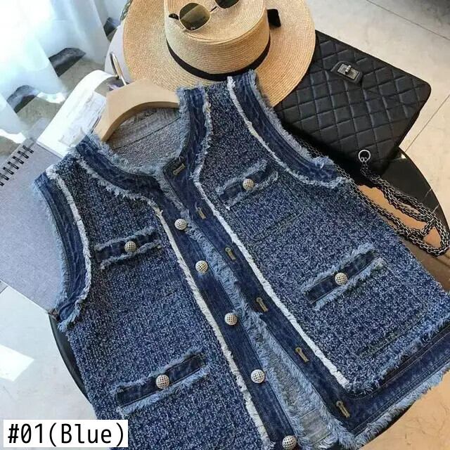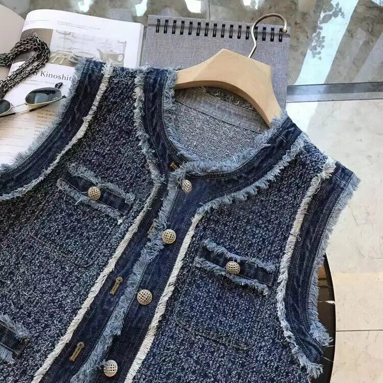 春秋 2024 フローノースリーブタンクトップコート香り良いファーエッジデニムベスト Chaleco Y2k ストリートジャケット スプリング 春物 オータム 秋物