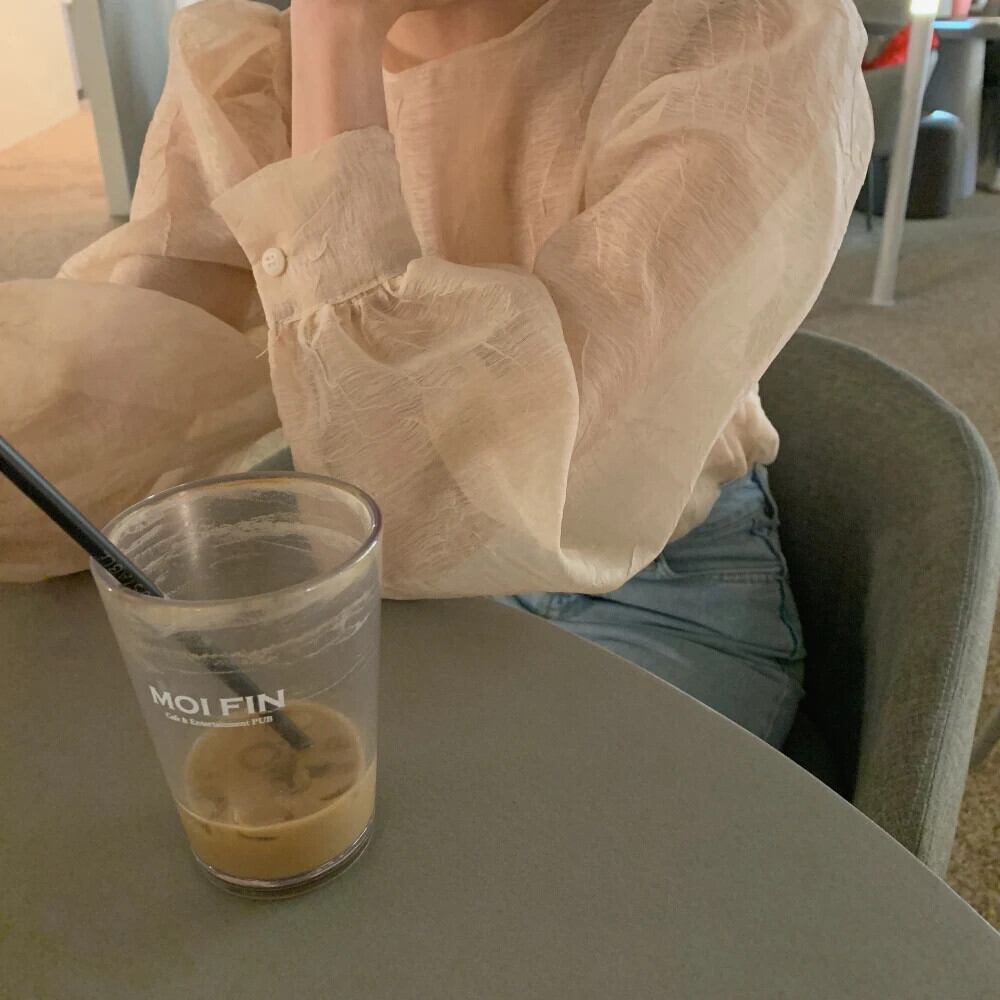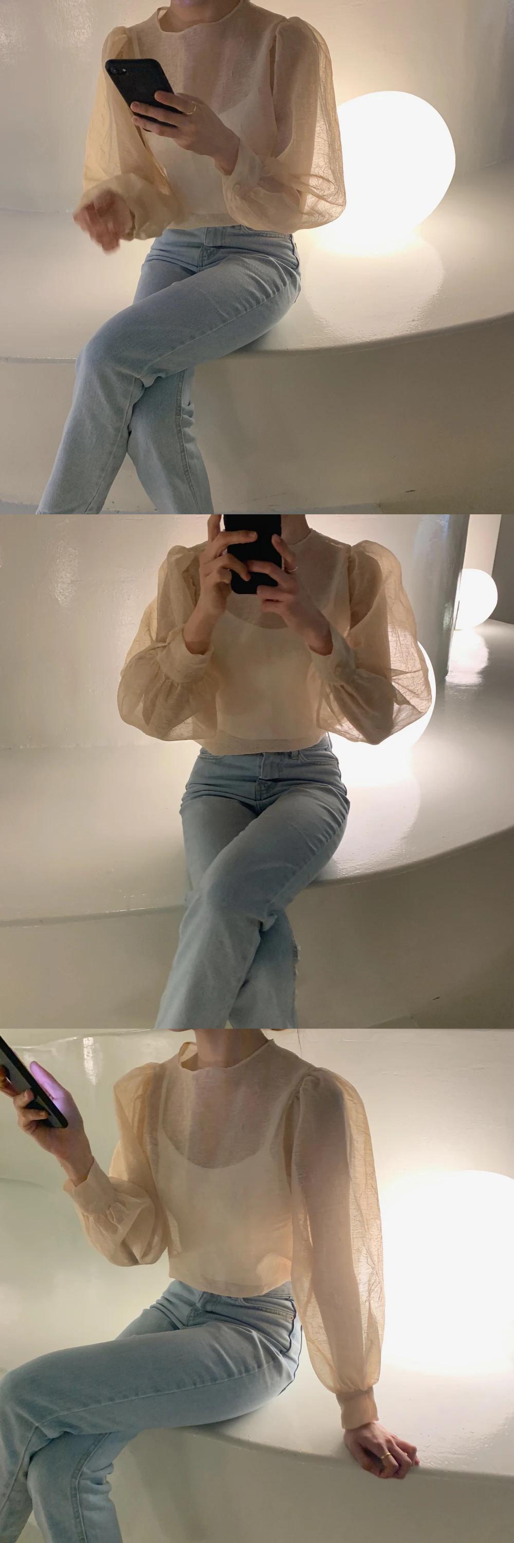 春スタイルラウンドネックしわメッシュわずか透明ルーズ長袖ボトムシャツブラウス薄いトップス ロング スプリング 春物 Oネック