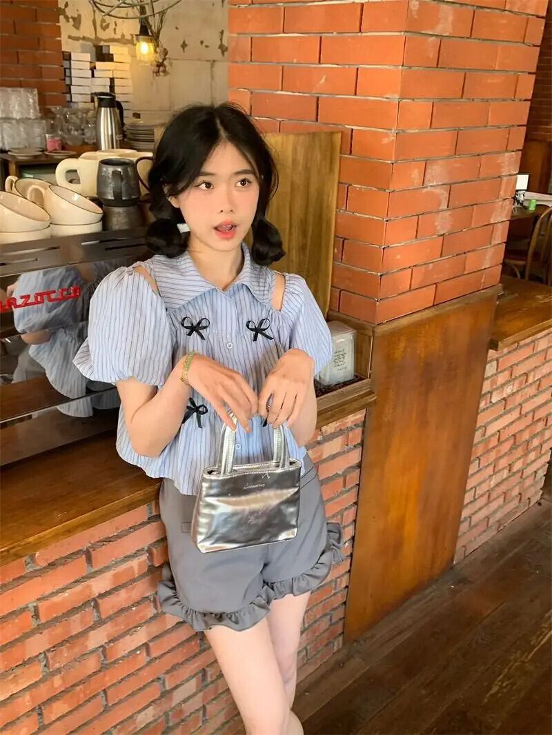 夏 2024 ブルーストライプ弓パッチワークシャツフレンチシックパフスリーブブラウスターンダウン襟ショルダーアウトトップ リボン サマー 夏物