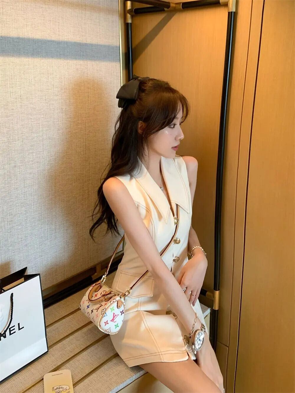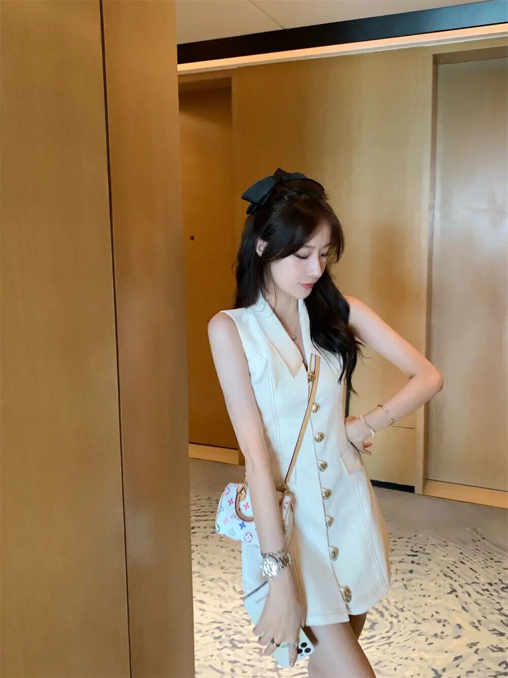 フレンチスタイルレトロソリッドカラースリム Vestidos ラペルノースリーブミニドレス高級シングルブレストエレガンス