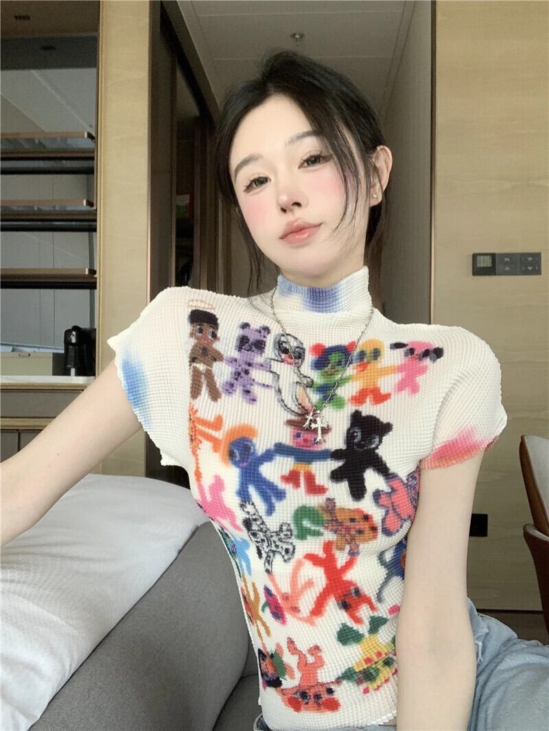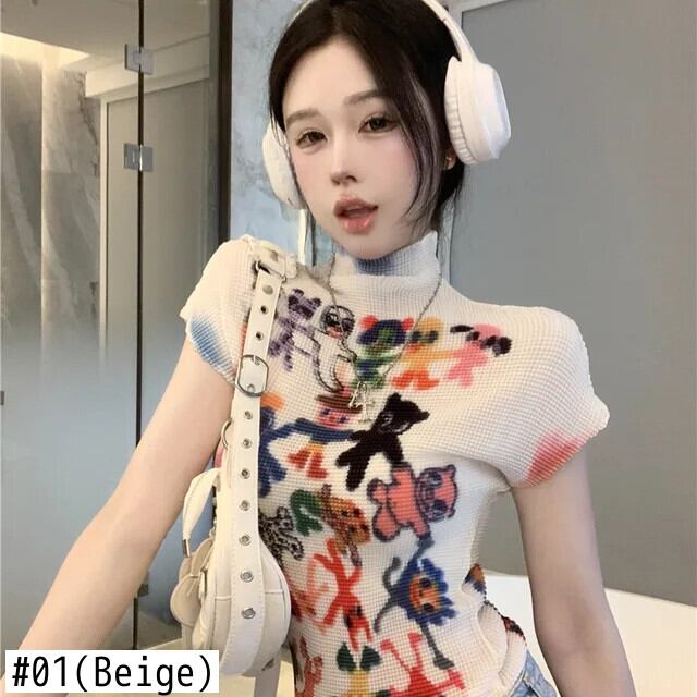 スタンドカラープリーツ半袖 Tシャツスリムフィットグラデーションカラー Comtable トップ 2024 夏グランジ Tシャツ ショート ハーフスリーブ サマー 夏物
