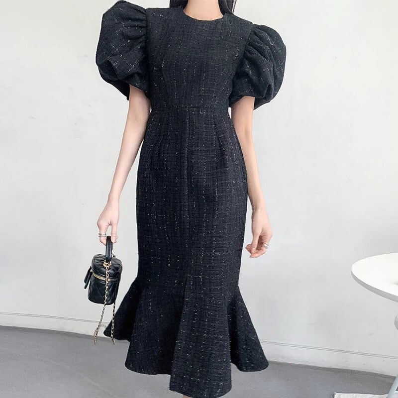 ラップヒップブラックツイードバブル半袖フィッシュテールドレス Vestido Y2k スーツローブビーチ夏 ショート ハーフスリーブ サマー 夏物