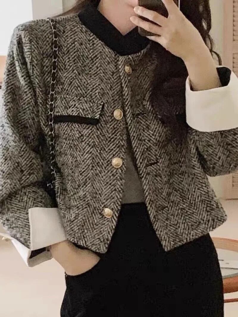コントラスト長袖スタンドネックショートニットカーディガンジャケット Chaquetas トップウールコートスーツ ロング