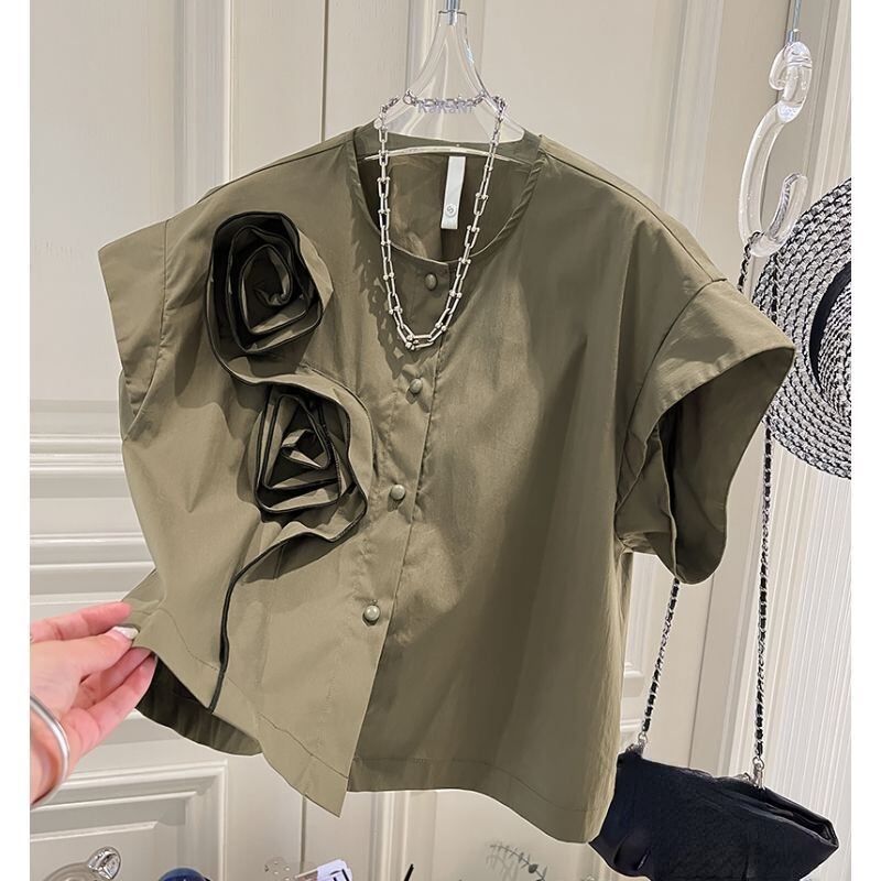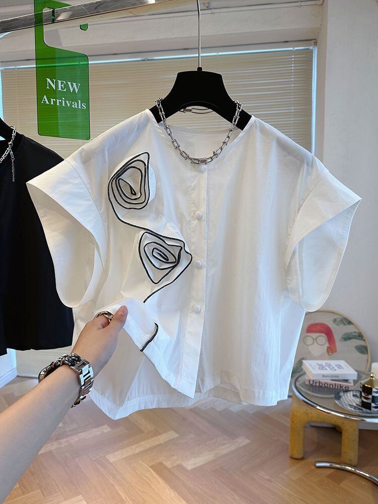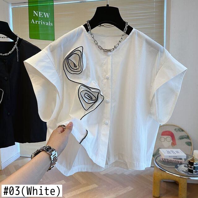 3D 花ラウンドネック小さシャツ 2024 夏シャツ s es 白ブラウスプリーツトップス人形 ホワイト サマー 夏物 Oネック フラワーデザイン