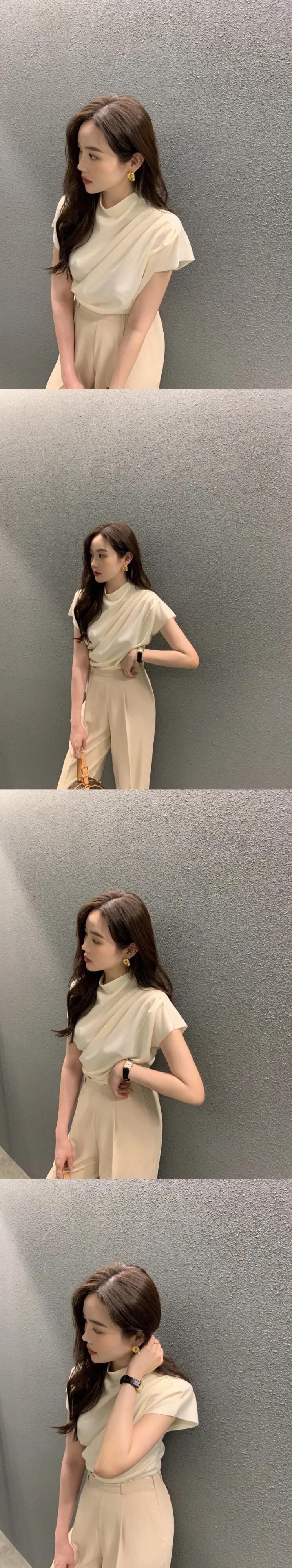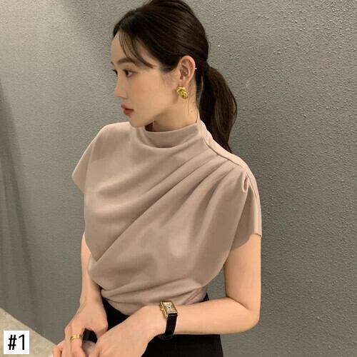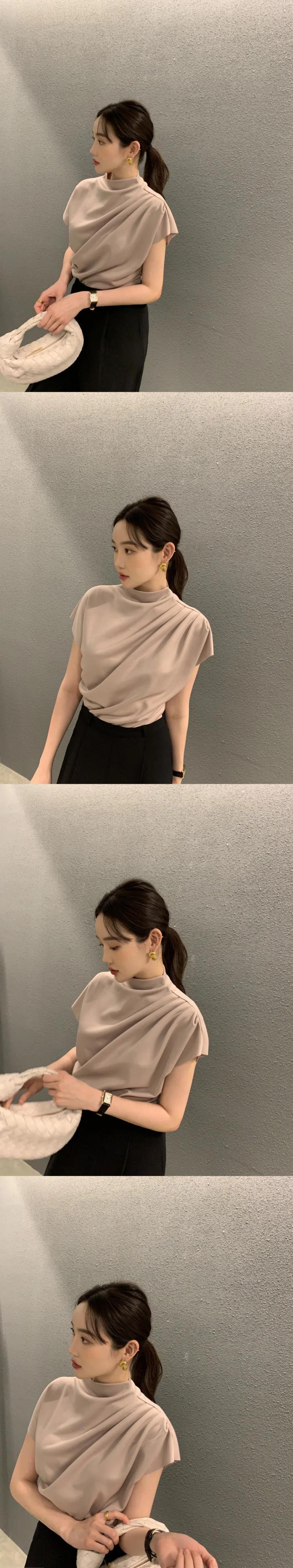 スタンドカラー斜めプリーツブラウス Blusa 2024 春夏半袖クロップトップスシックパーティーシャツ ショート ハーフスリーブ スプリング 春物 サマー 夏物