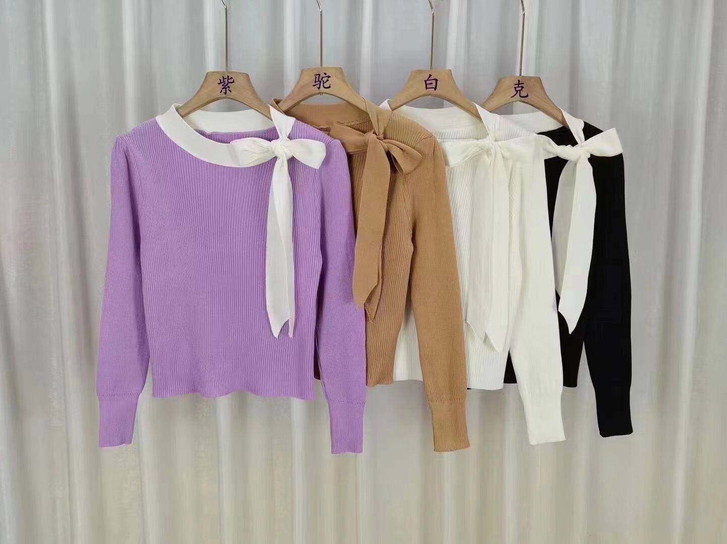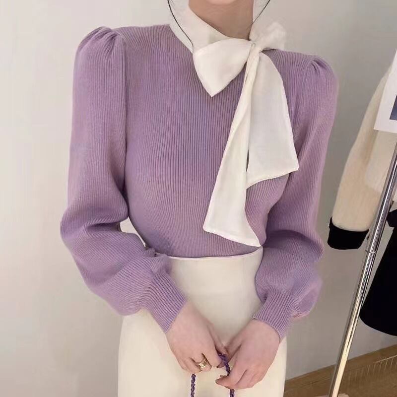 ホルターパープルオフィスレディセーター弓リボンスリムストレッチ長袖プルオーバーフレンチスタイルシックベーシックトップス ロング 会社 学校 通勤や通学にも