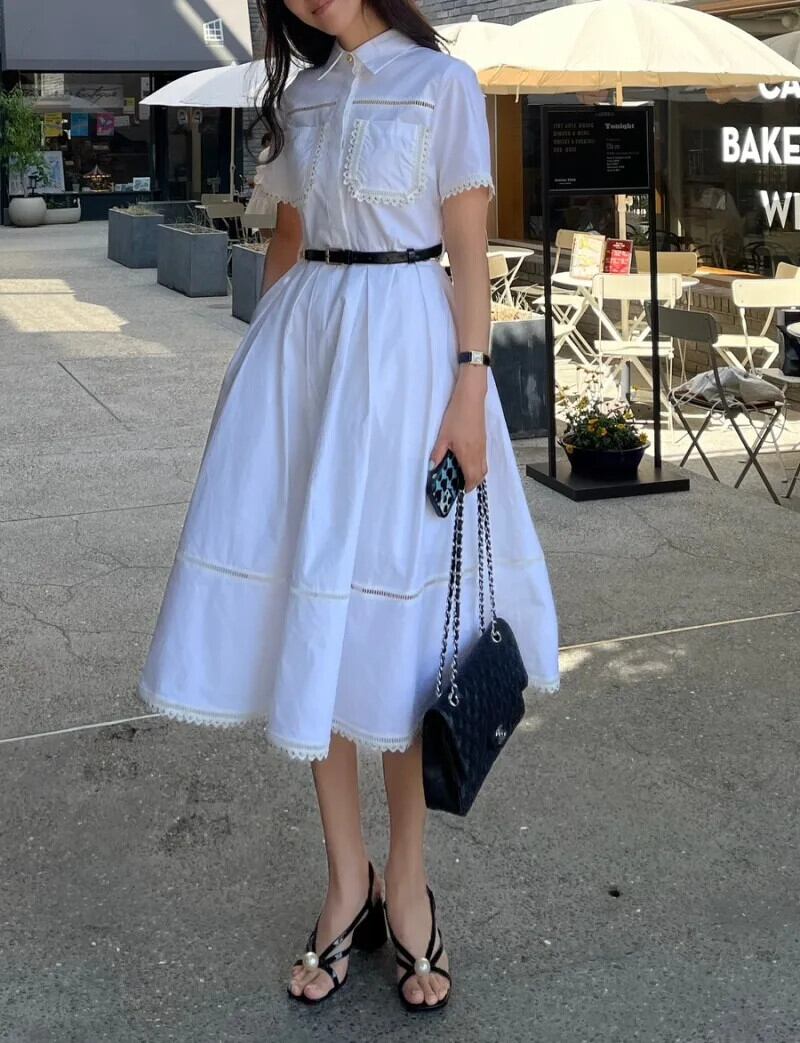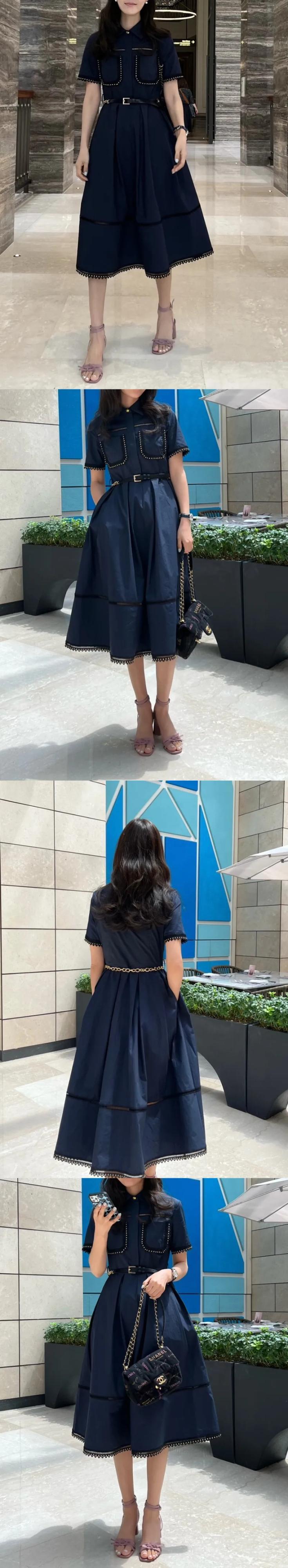 2024 夏フレンチジェントルシックレトロウエストスリムスカートフックフラワー Vestidos レースラペル半袖ドレス ショート ハーフスリーブ サマー 夏物 フラワーデザイン