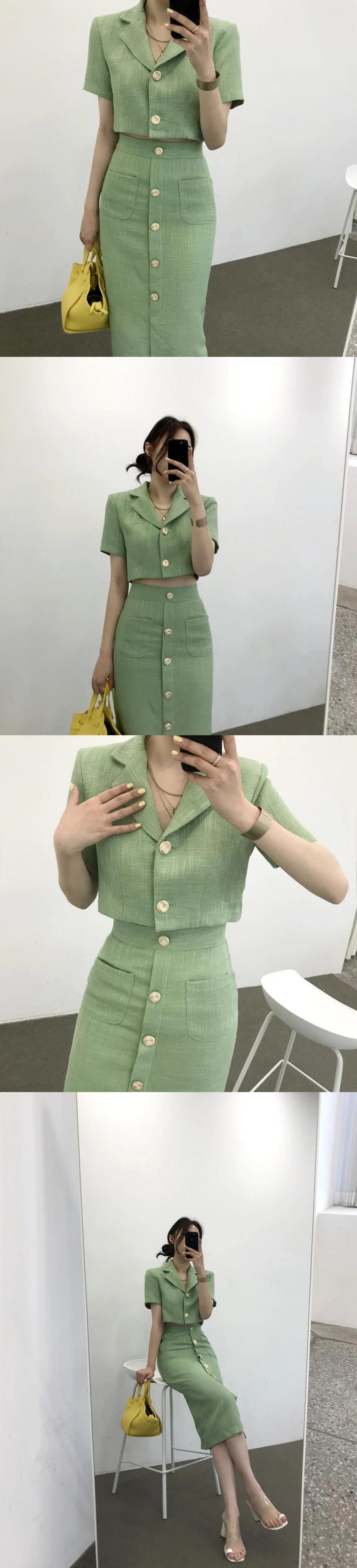 ラペル薄いツイード小さスーツショートジャケットウエストシックボタンスリムレディースツーピーススカートセット夏 サマー 夏物