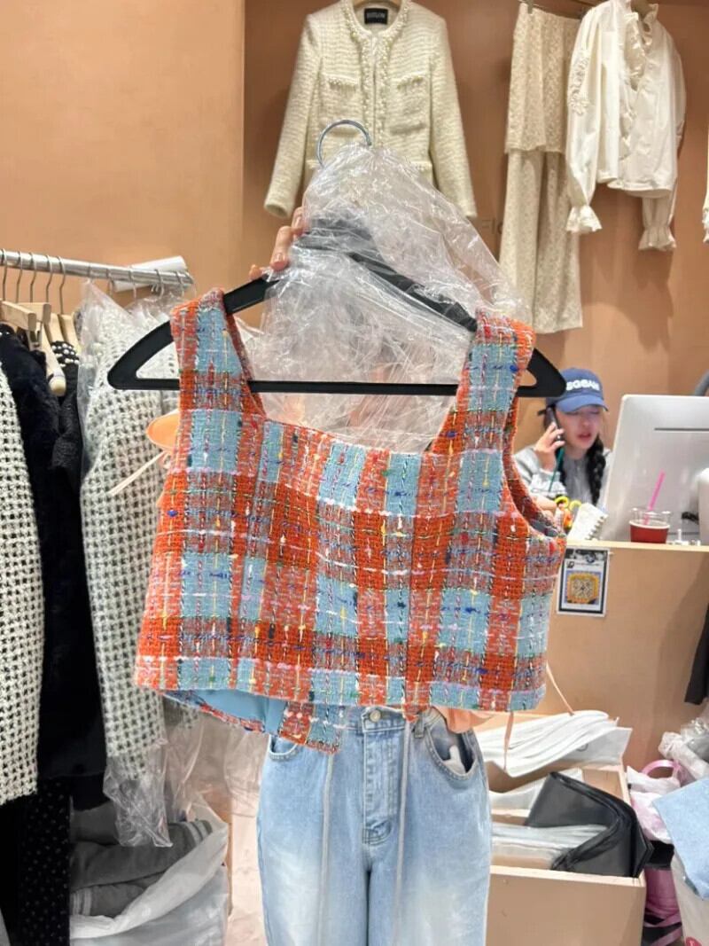 作物ジャケット秋スリム Y2k スクエアカラーチェック柄ベストチョッキ Chalecos パラウールタンクトップホット甘い 大人ガーリー スウィート キュート カジュアル オータム 秋物 スクウェア