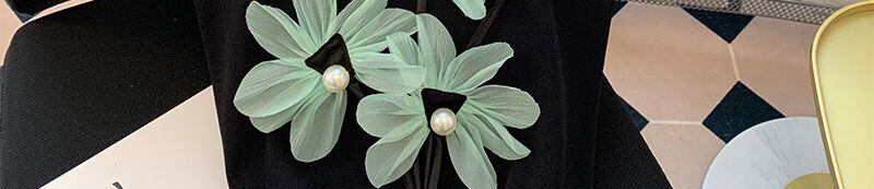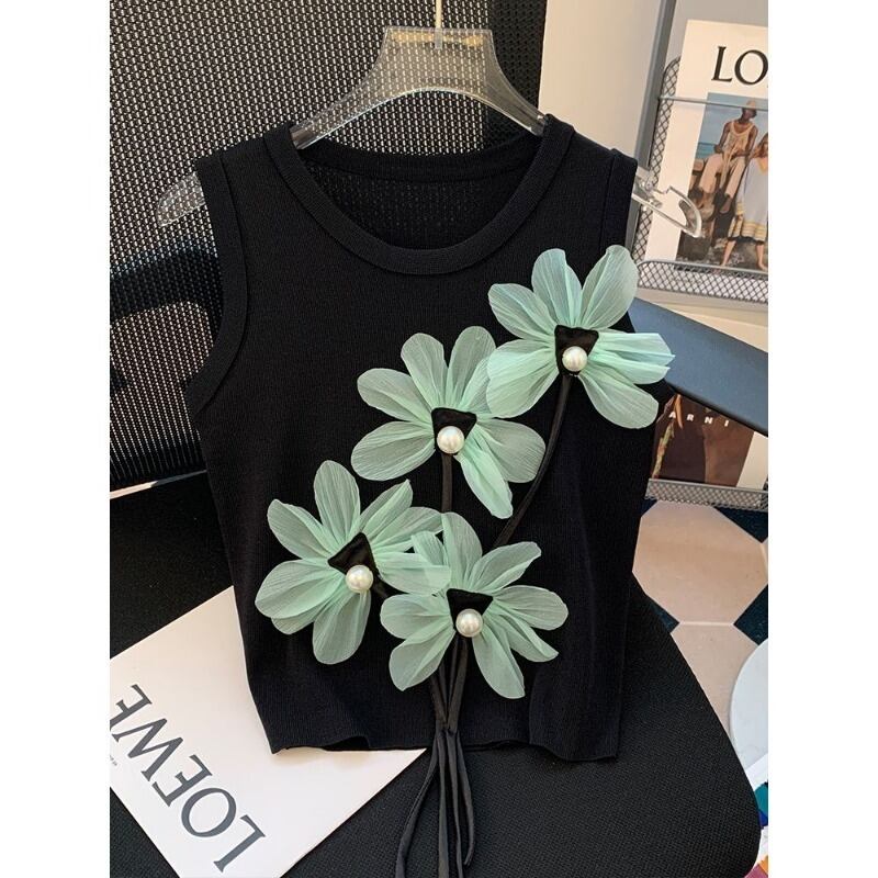立体花柄ニットセーターベストショートノースリーブトップラウンドネックブラック2024 半袖 ハーフスリーブ Oネック