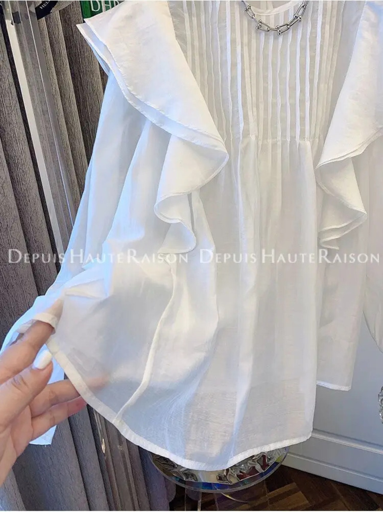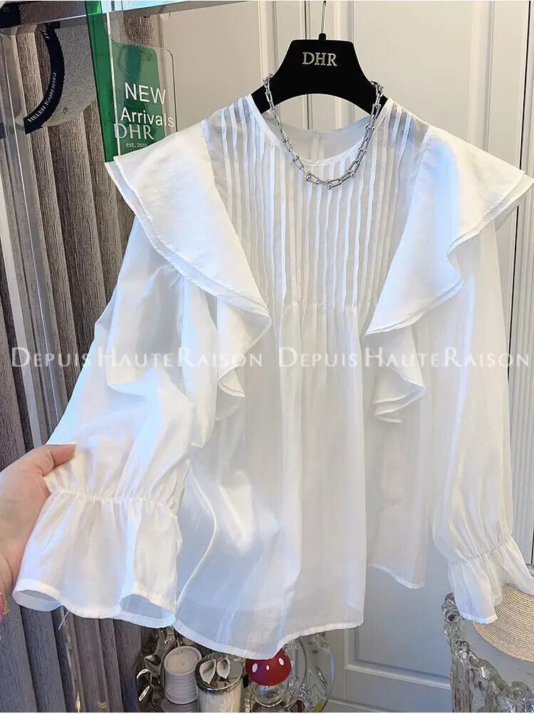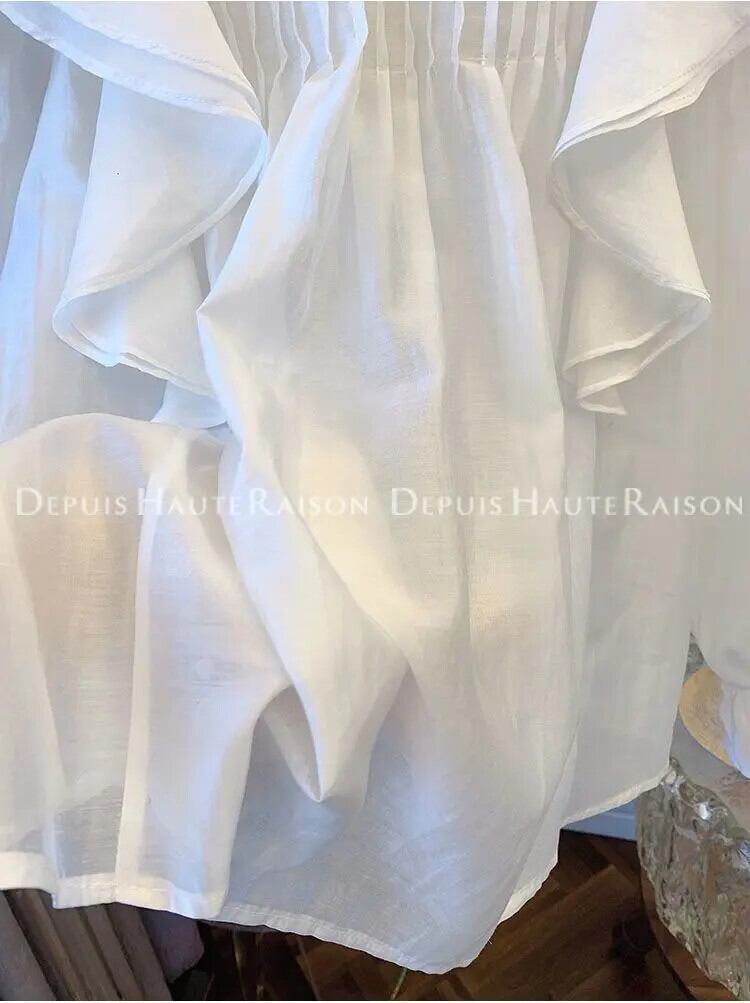 De Moda 2024 Roupas シフォンドールシャツフレンチフリル白シャツ小さフライングスリーブトップルーズブラウス ホワイト