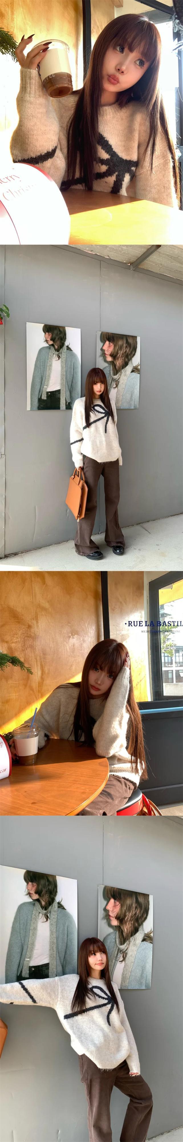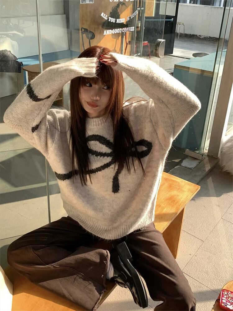 2024 ボウノットジャカードラウンドネックセーター秋 Y2k 因果長袖プルオーバーニットトップスプル ロング リボン オータム 秋物 Oネック