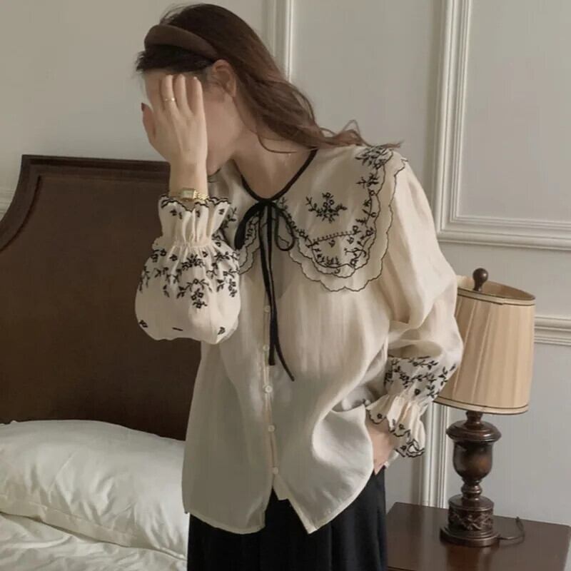 ブラウス春人形刺繍ラペル甘いルーズトップス es シャツメッシュシフォン レッド 大人ガーリー スウィート キュート カジュアル スプリング 春物
