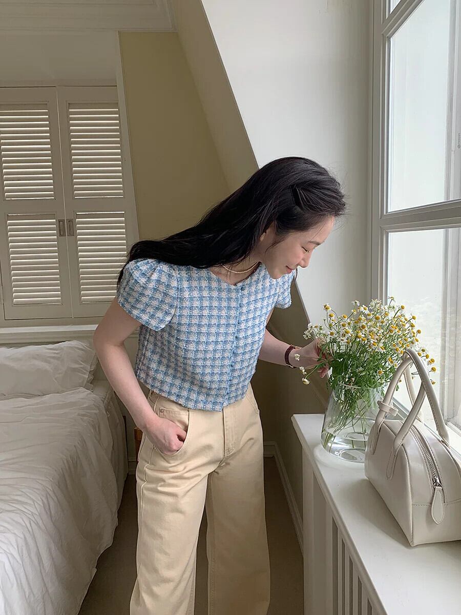 気質ツイードジャケット Ropa 2024 夏クロップトップブルーチェック柄シャツスタイル Chaquetas コートスーツブレザー サマー 夏物
