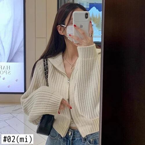 クロップドカーディガン 2024 秋怠惰スタイルスリムセーターソリッドダブルジップジャケット袖プルトップニット オータム 秋物 ソリッドカラー