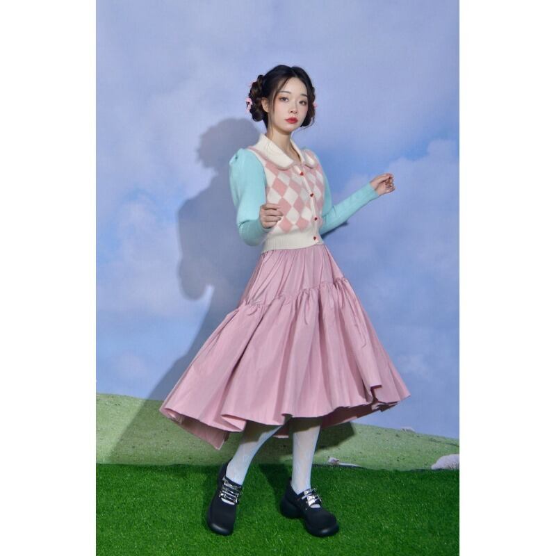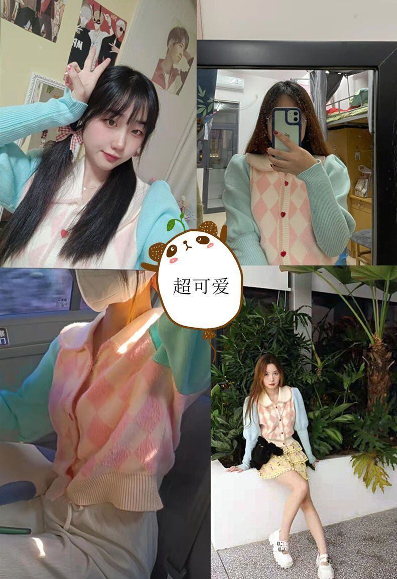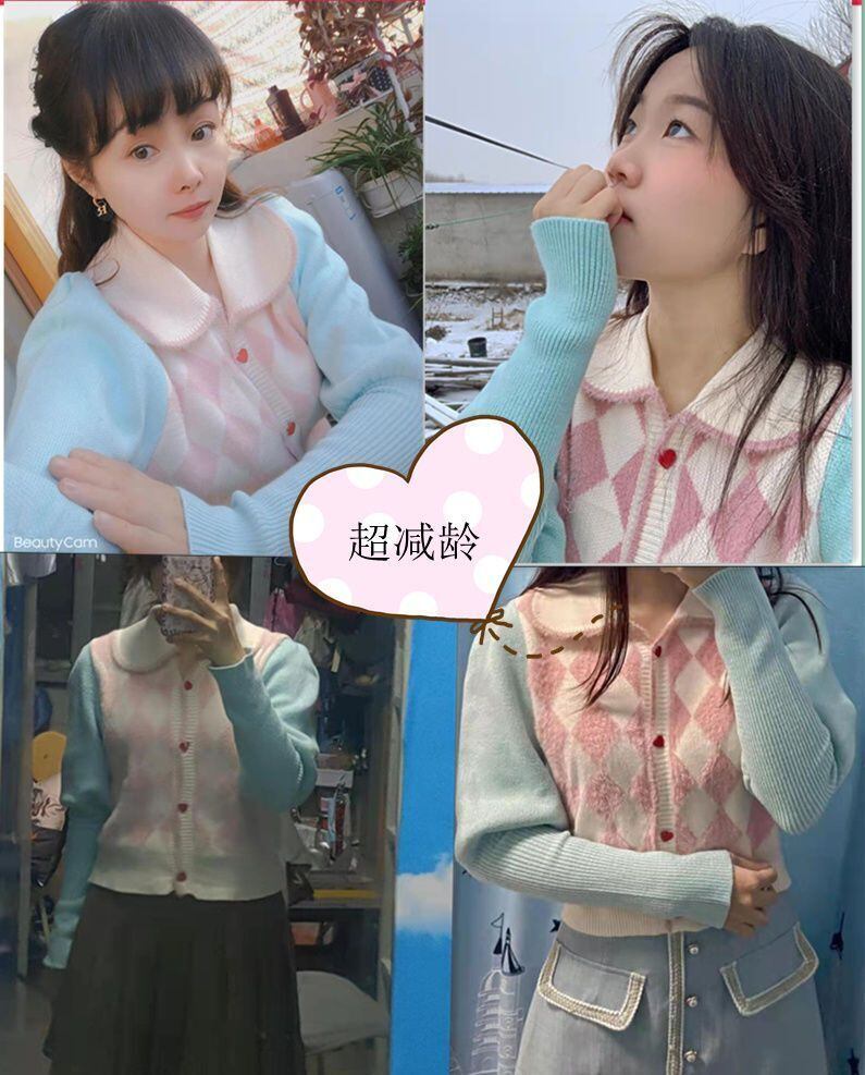 ピンクブルーチェック柄セーター長袖カーディガンドールネックかわいい赤桃ボタンジャカードバブルスリーブコート 2024 スリムセーター ロング レッド 大人ガーリー スウィート キュート カジュアル
