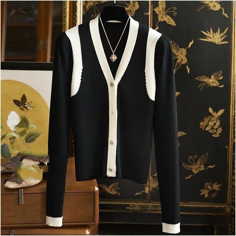 カーディガン セーター 長袖 トップ プル V ネック コントラスト ダイヤモンド ボタン ニット ジャケット セーター Y2k トップス ロング Vネック