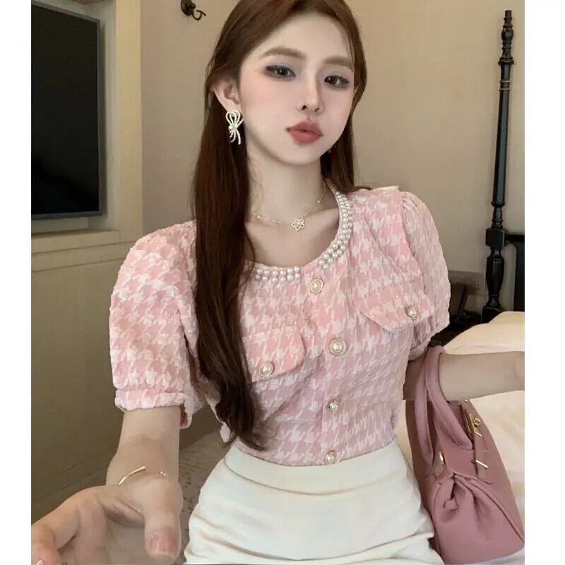 ジャカード ピンク サウザンド バード チェック柄 ブラウス es クロップ トップス 半袖 ジャケット シャツ ショート ハーフスリーブ