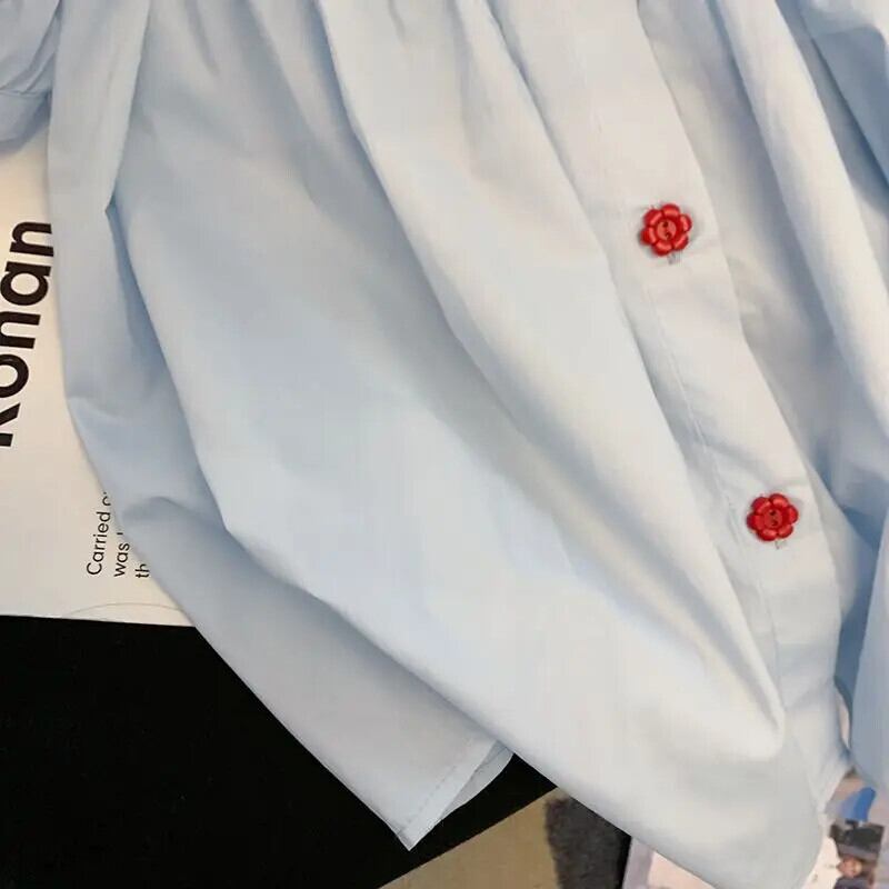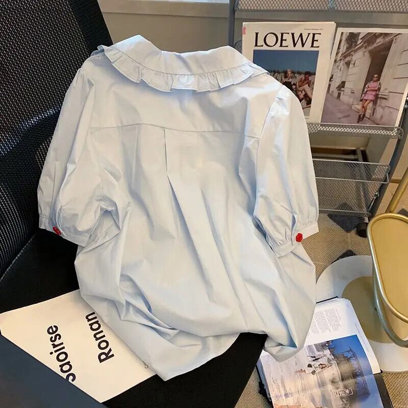 De Moda 2024 Verano 夏クロップトップス ブルー ese ドールネック半袖シャツプリーツブラウスシャツ ショート ハーフスリーブ サマー 夏物