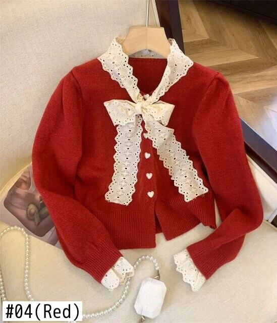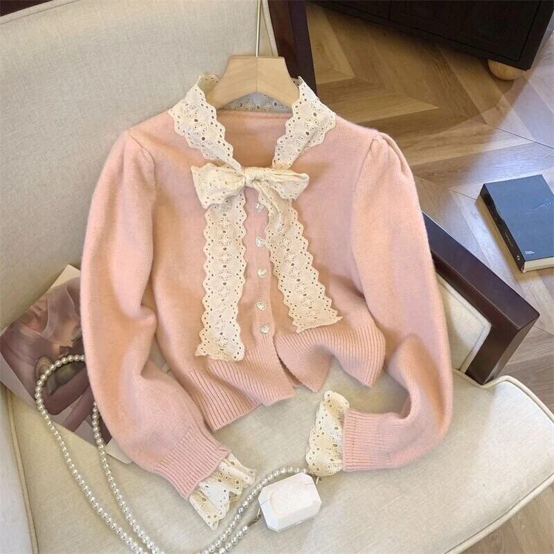 レースリボンクロップドカーディガンプルニットピンクセーターセーターデスタイルスリムトップス長袖ジャケット春秋 ロング スプリング 春物 オータム 秋物