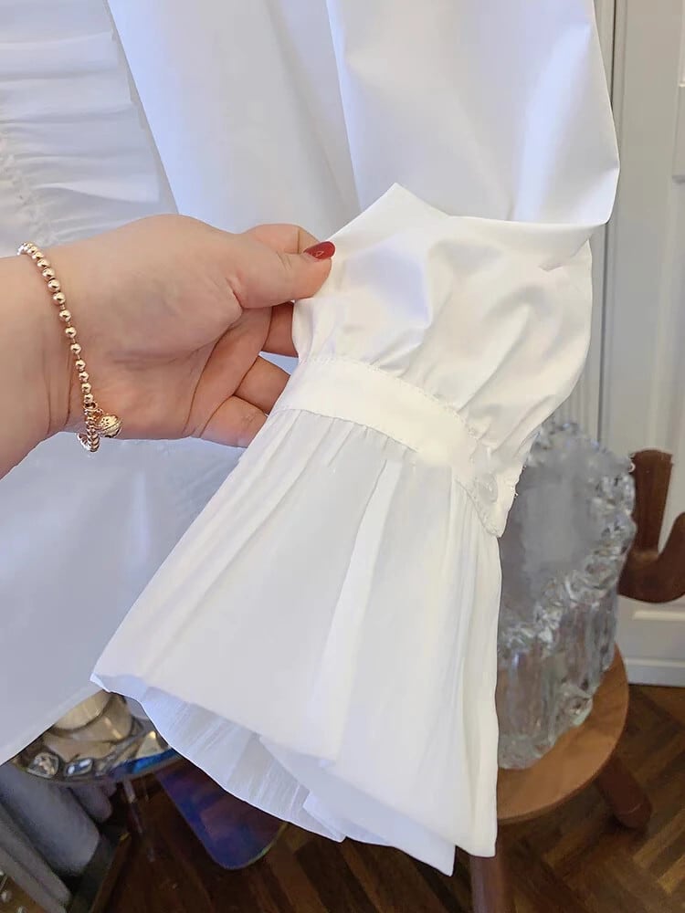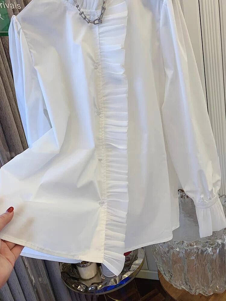 ブラウス 2024 白シャツフレンチフリルルーズ立ち襟長袖 Blusa トップ ロング ホワイト