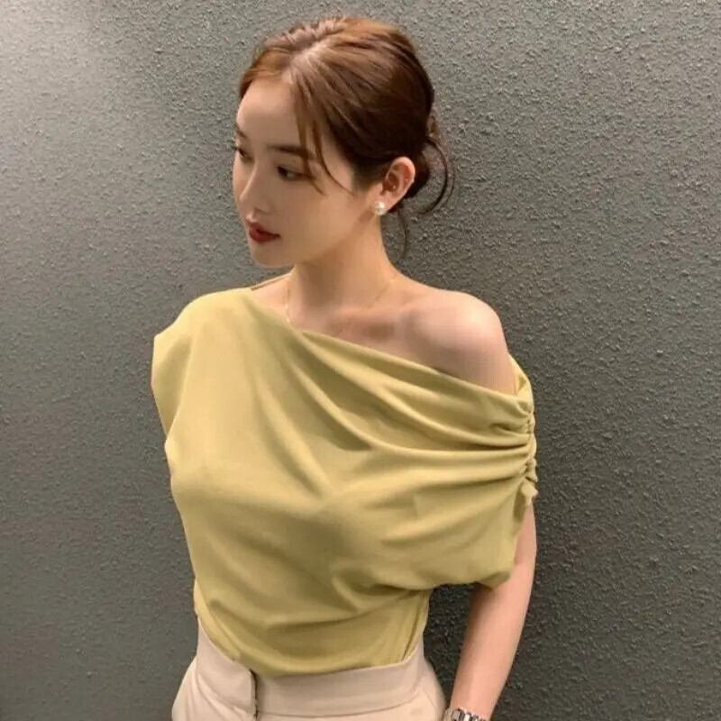 白斜め肩半袖 Tシャツ作物気質スリムトップス原宿 Tシャツグランジロパブラウス ショート ホワイト ハーフスリーブ かわいい ソリッドカラー