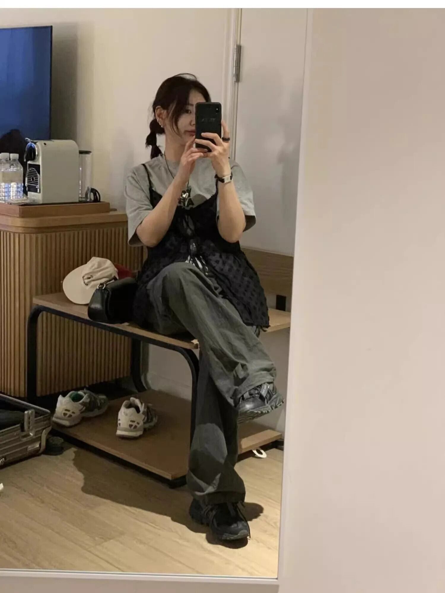黒夏ニッチ Y2k トップススリングフラワーパースペクティブメッシュガーゼレースアップセクシーサスペンダーグランジ個性ソリッドカラー ブラック サマー 夏物 フラワーデザイン